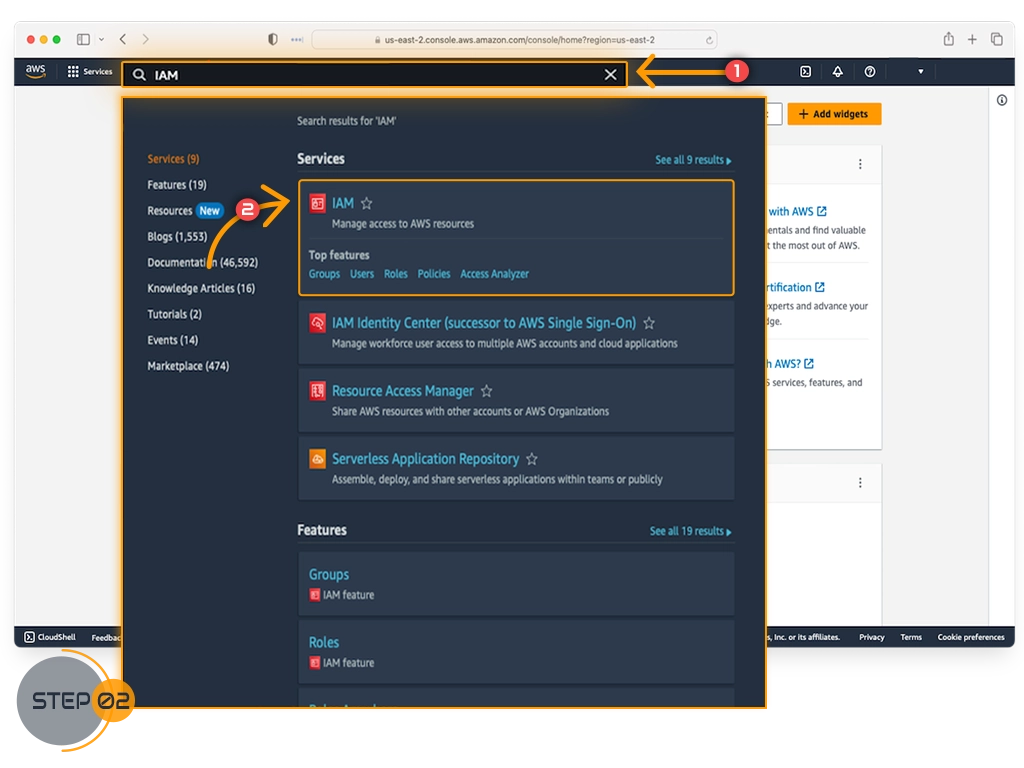 In the search bar at the top, type IAM and select IAM (Identity and Access Management).