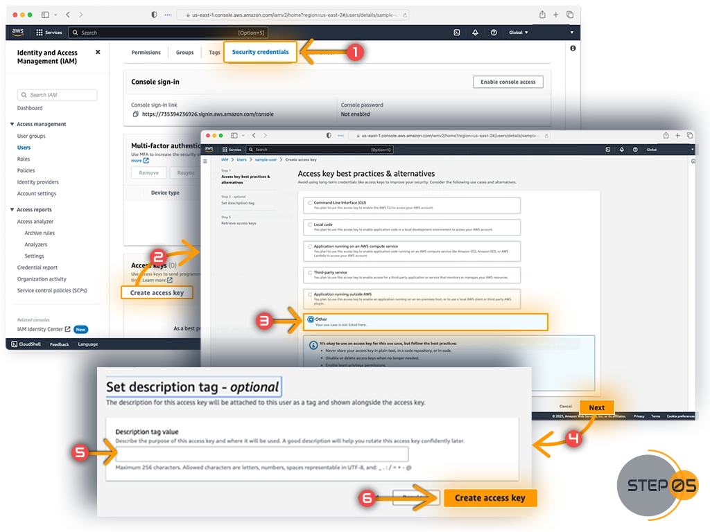 To connect Namirasoft applications with your AWS account, you need an Access Key and a Secret Key. These act like a username and password for secure programmatic access.
