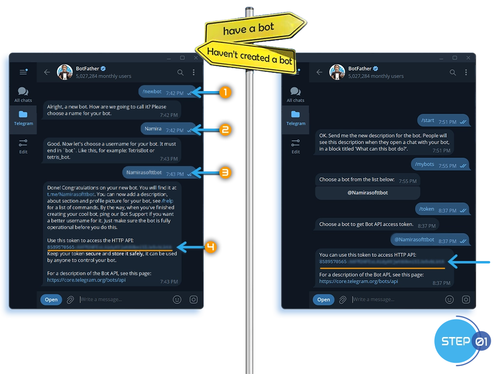 - BotFather will provide the new bot’s API token.